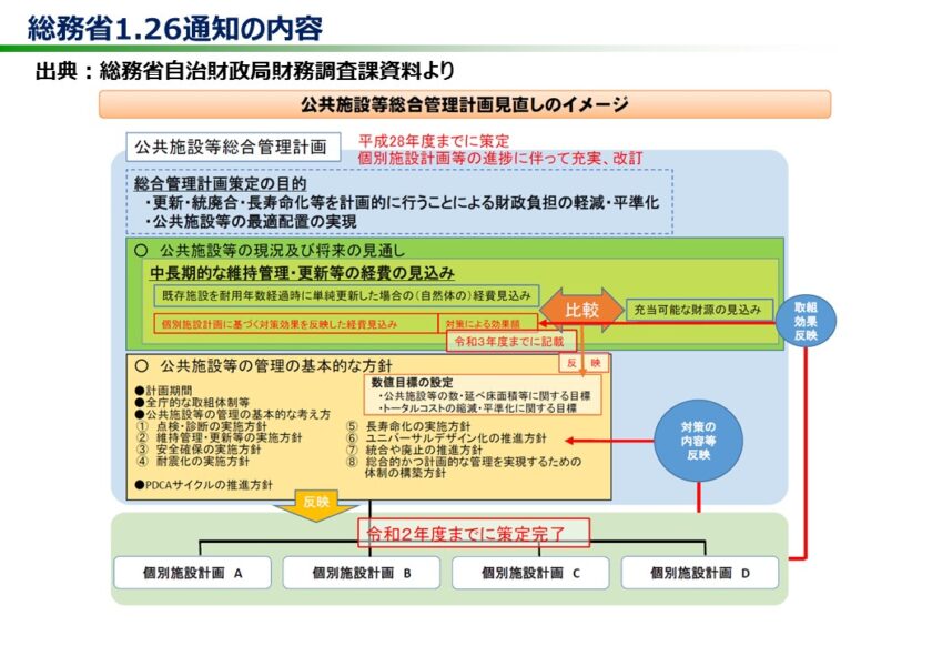 2021/1/26付、総財務第6号「令和3年度までの公共施設等総合管理計画の見直しに当たっての留意事項について」により、本年度中に、個別施設計画等を踏まえた公共施設等総合管理計画の見直しが求められております。