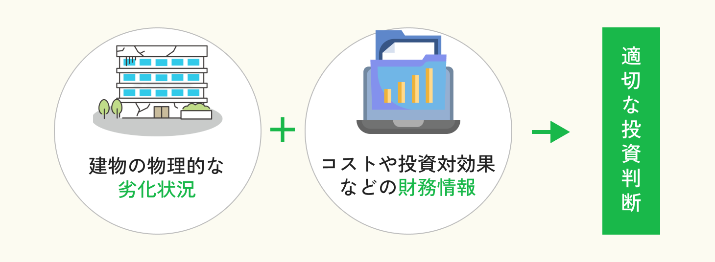 経営的な判断を下すためには、建物の物理的な劣化状況だけでなく、コストや投資対効果といった財務情報が必要です。