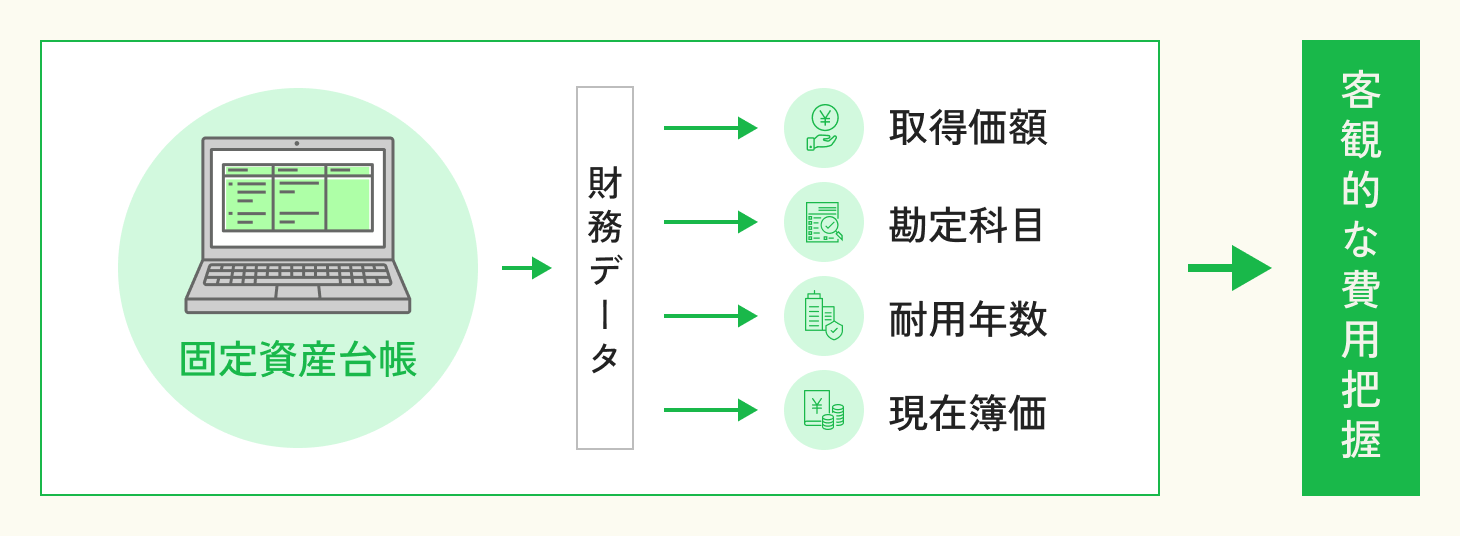 固定資産台帳には、取得価額、勘定科目、耐用年数や、現在簿価などの財務データが網羅されており、客観的な費用把握が可能になるからです。